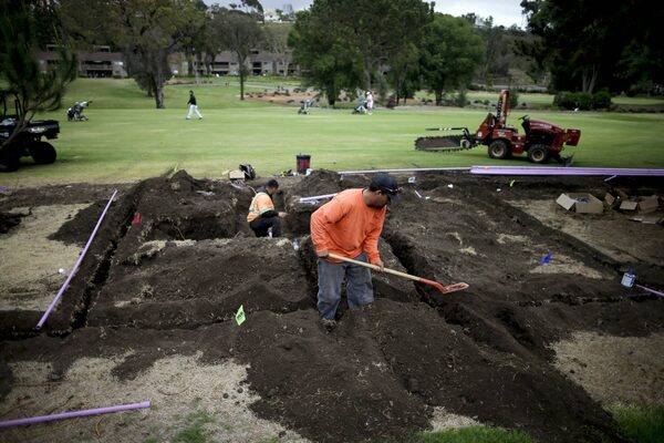 Workers install high-tech moisture monitoring systems at a country club in Laguna Niguel, California.Gregory Bull/The Associated Press