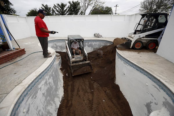 Jesus Rivera (L) works on a swimming pool demolition for a homeowner who is going to replace the pool with a drought resistant garden Lakewood, California.Lucy Nicholson/Reuters