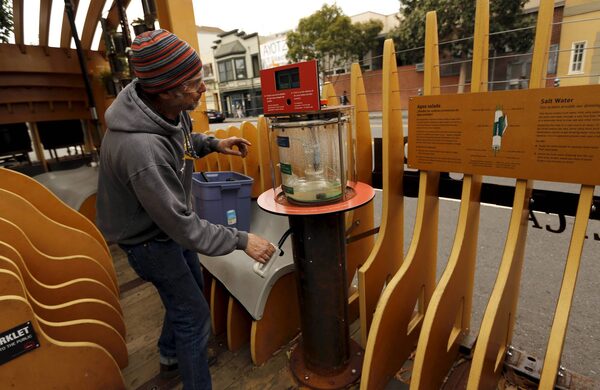 Scientist Eric Dimond cranks a desalination pump by hand to display the process of turning salt water to fresh water at a public parklet in San Francisco.Robert Galbraith/Reuters