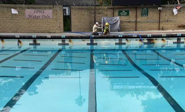 Workers empty the South Pasadena High School pool. The water is offered to the public free for gardening use.Frederic J. Brown/AFP / Getty Images