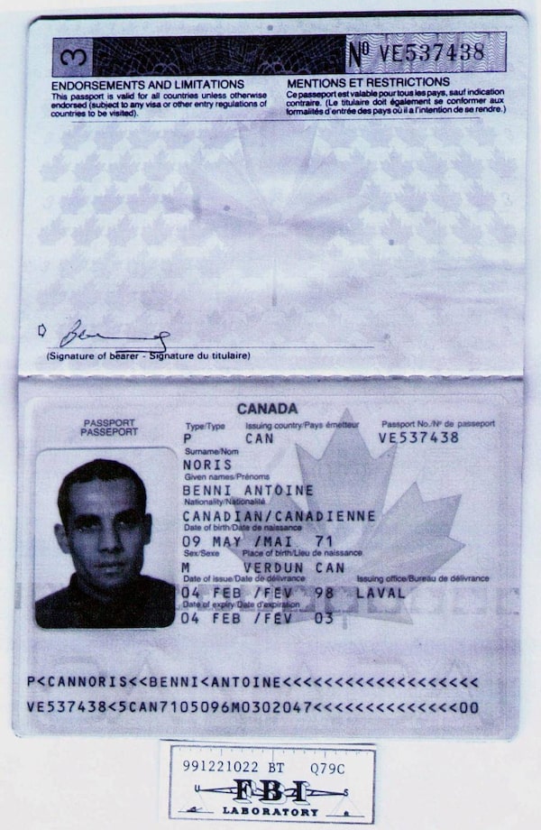 The false Canadian passport used by Algerian Ahmed Ressam when he lived in Canada and attempted to enter the United States is shown in this photocopy of an evidence exhibit provided by U.S. federal prosecutors following Mr. Ressam’s conviction on several terrorism-related charges.NICK UT/The Associated Press