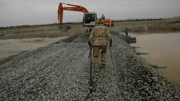 A Canadian soldier pulls lengths of chain to help with the building of a small bridge as part of a Canadian engineer road construction project near the Mas'um Ghar base in the Kandahar Province of Afghanistan on Nov. 22, 2006.DAVID GUTTENFELDER