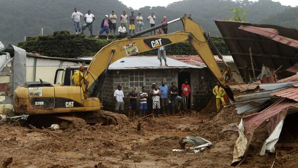 People look on as machinery is used to remove mud after a mudslide in Portobelo, northern Panama, Friday, Dec. 10, 2010. A landslide due to heavy rains killed at least eight people on Wednesday.Arnulfo Franco/AP