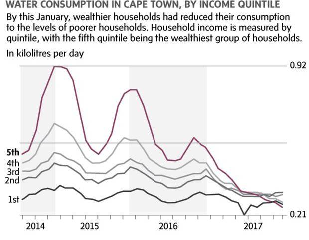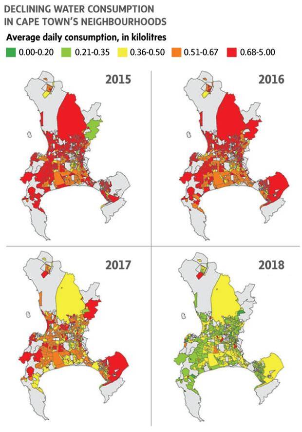 But since then, Day Zero has been repeatedly pushed back, from its earliest projected date of April 12 to its current date of late August – partly because of a reduction in dam water for farms, but also because of a drastic decline in urban consumption. Normal winter rains, assuming they arrive, will postpone Day Zero by a further year.