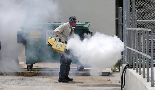 A Miami-Dade County mosquito control worker sprays around a school in the Wynwood area of Miami on Monday, Aug. 1, 2016.Alan Diaz