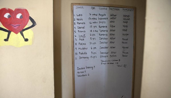 The board that lists the names, origin, and status of the children who are staying in the home the Save A Heart organization has provided for those both before and after surgery in the central Israeli town of Azur, May 17, 2011.Heidi Levine/Sipa Press