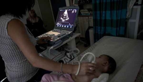 Israeli echocardiogram (ECO) technician Yafat Broush during an exam on eight-month-old Palestinian baby Nebaa Al- Attar Fayez at Wolfson Hospital in Holon, Israel May 31, 2011 . Nebaa suffers from a severe cardiac condition and her medical treatment is being sponsored by the Israeli based Save A Child's Heart organization . Today doctors evaluated the child's cardiac condition , Tetrolgoy of Fallot, and scheduled her for open heart surgery in July .Heidi Levine/Sipa Press