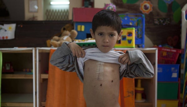 Romanian six-year-old Ionut proudly lifts his shirt to show off his scar from the heart surgery he is recovering from that was performed by Israeli doctors under the Save A Heart organization. The child stays in a home with others from around the world in a home in the central Israeli town of Azur during the prep and post operative stages of the heart surgery.Heidi Levine/Sipa Press