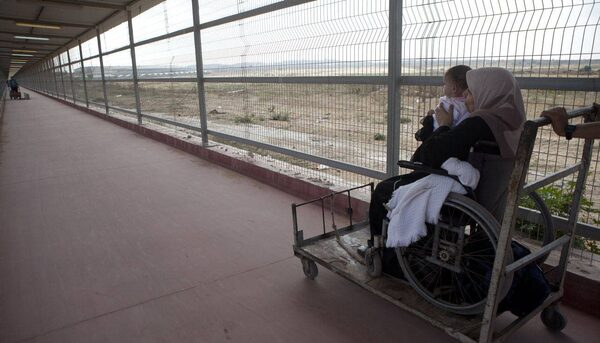 Eight-month-old Palestinian baby Nebaa Al- Attar Fayez is escorted by her grandmother Fatma who sits in a wheel chair that has been placed on top of a metal wagon as they are wheeled from the Palestinian side of the Erez checkpoint across the two kilometer encaged passage way to the Israeli side of the checkpoint where they will enter Israel, May 32, 2011. Neba suffers from a severe cardiac condition and her medical treatment is being sponsored by the Israeli based Save A Child's Heart organization . Doctors evaluated the child's condition and scheduled her for open heart surgery in July . Her grandmother escorted the baby instead of the mother because she was too scared to witness her child undergoing medical treatment.Heidi Levine/Sipa Press