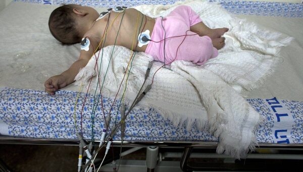 Eight-month-old Palestinian baby Nebaa Al-Attar Fayez during an Electocardiography examination (ECG) examination at Wolfson Hospital in Holon, Israel May 31, 2011.Heidi Levine/Sipa Press