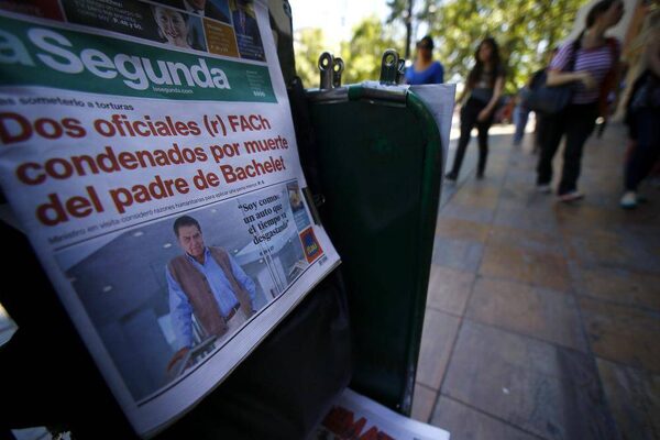 An afternoon edition of the La Segunda newspaper, with its frontpage headline reading "Two Air Force officers convicted of killing the father of Bachelet", the latter referring to Chilean President Michelle Bachelet, is seen at a stand in downtown Santiago November 21, 2014.IVAN ALVARADO/Reuters