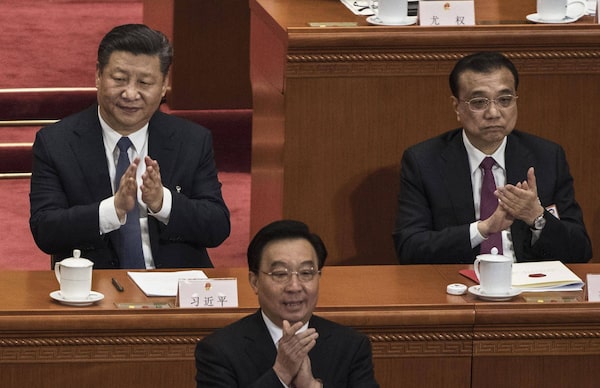 China's President Xi Jinping and Premier Li Keqiang, applaud during a session of the National People's Congress after voting on a constitutional amendment at The Great Hall Of The People on March 11, 2018 in Beijing. After China’s state media described the proposed constitutional term-limit change, censors rapidly moved to censor more than 50 terms in the country.Kevin Frayer