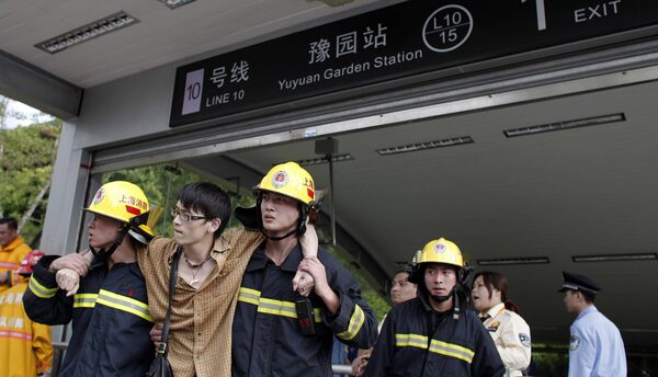 Firemen help evacuate a victim outside the Yuyuan Garden station after a subway crash in Shanghai.Carlos Barria/Reuters
