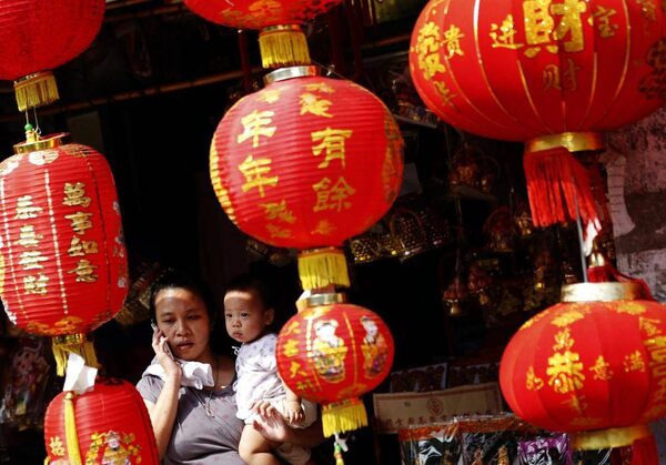 A woman holds her son as she shops for Lunar New Year decorations in Bangkok, Thailand Tuesday, Feb. 17, 2015. Chinese authorities have cancelled some Lunar New Year events in wake of last month’s deadly stampede.Sakchai Lalit/The Associated Press