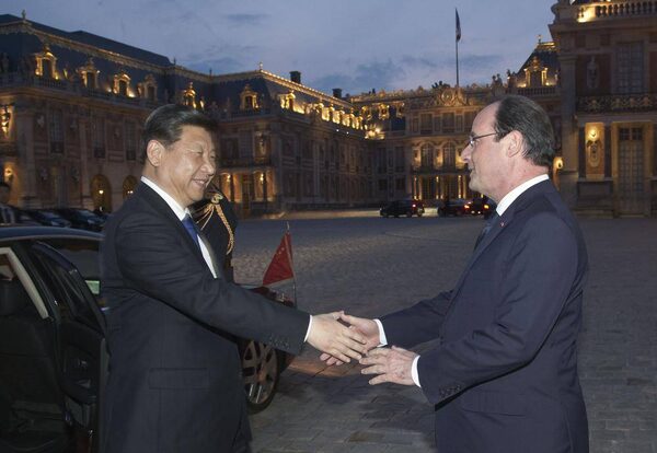 Chinese President Xi Jinping, left, is welcomed by French President François Hollande, right, at the Chateau de Versailles, in Versailles, west of Paris, for a concert and dinner March 27, 2014.Michel Euler/The Associated Press