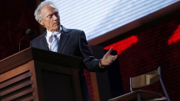 Actor Clint Eastwood addresses an empty chair and questions it as if it is U.S. President Barack Obama, as he endorses Republican presidential nominee Mitt Romney during the final session of the Republican National Convention in Tampa, Fla., on Aug. 30, 2012.ERIC THAYER/Reuters