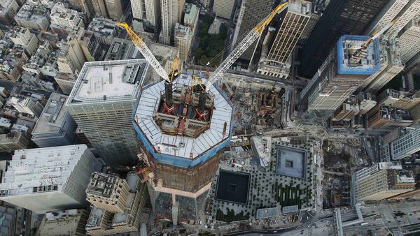The under-construction One World Trade Center stands over the World Trade Center construction site and the National September 11 Memorial and Museum in New York's Lower Manhattan August 24, 2011.LUCAS JACKSON