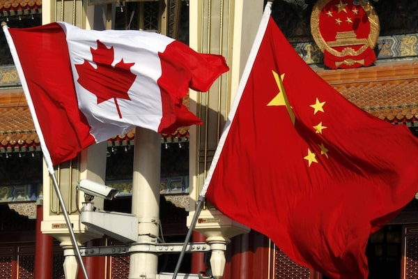 Canadian and Chinese national flags hang from a lamp post in front of the giant portrait of former Chinese Chairman Mao Zedong at Beijing's Tiananmen Square December 2, 2009.DAVID GRAY/Reuters