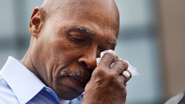 Snohomish County Executive John Lovick wipes a tear during a briefing in downtown Arlington Monday, March 24, 2014. (AP Photo /The Herald, Annie MulliganAnnie Mulligan