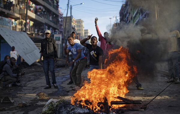 Opposition protesters taunt riot police to come and get them, as they stand behind a burning barricade during clashes with police in the Mathare slum of Nairobi, Kenya Thursday, Oct. 26, 2017.Ben Curtis