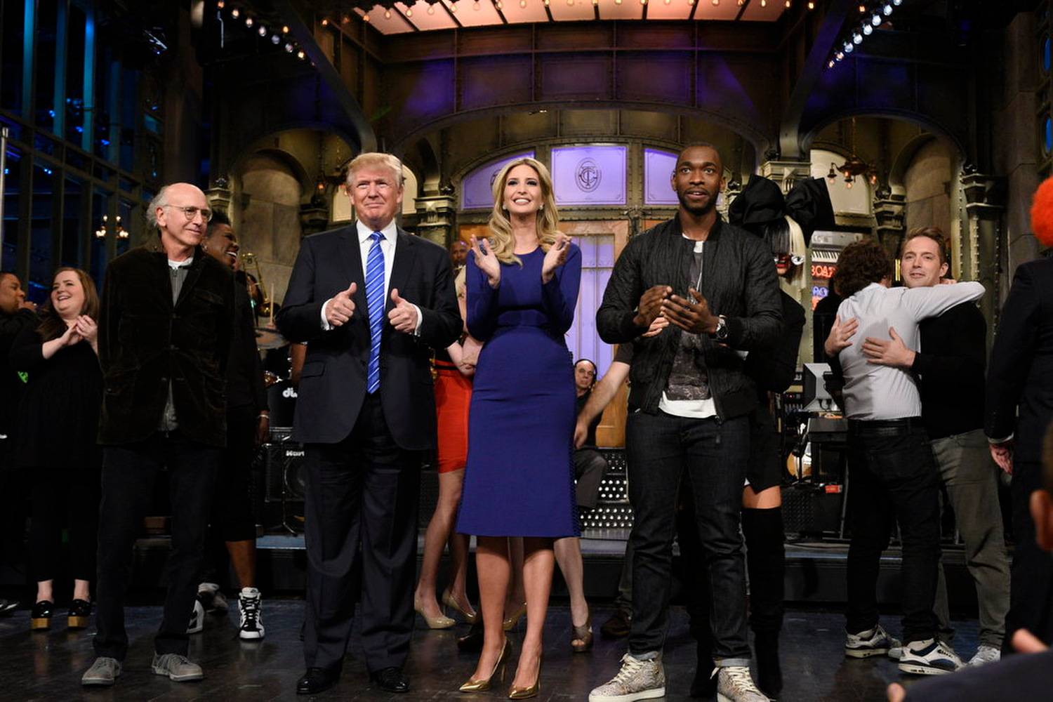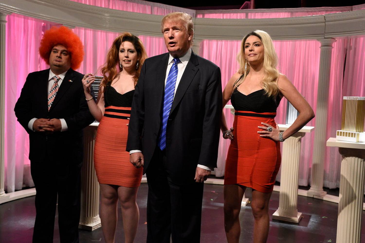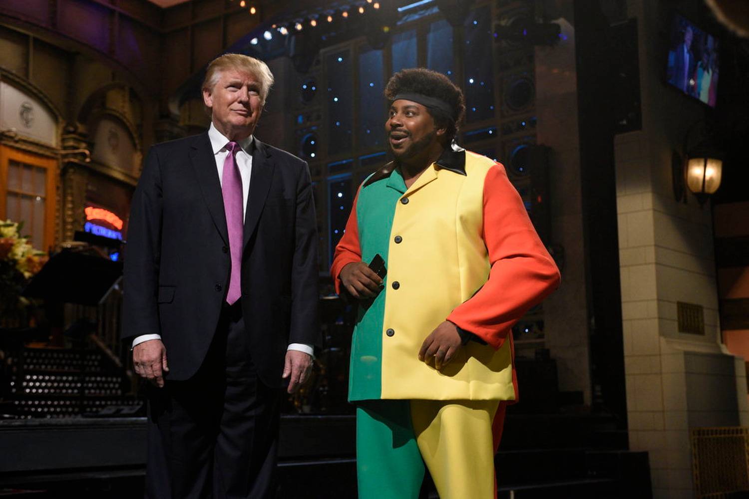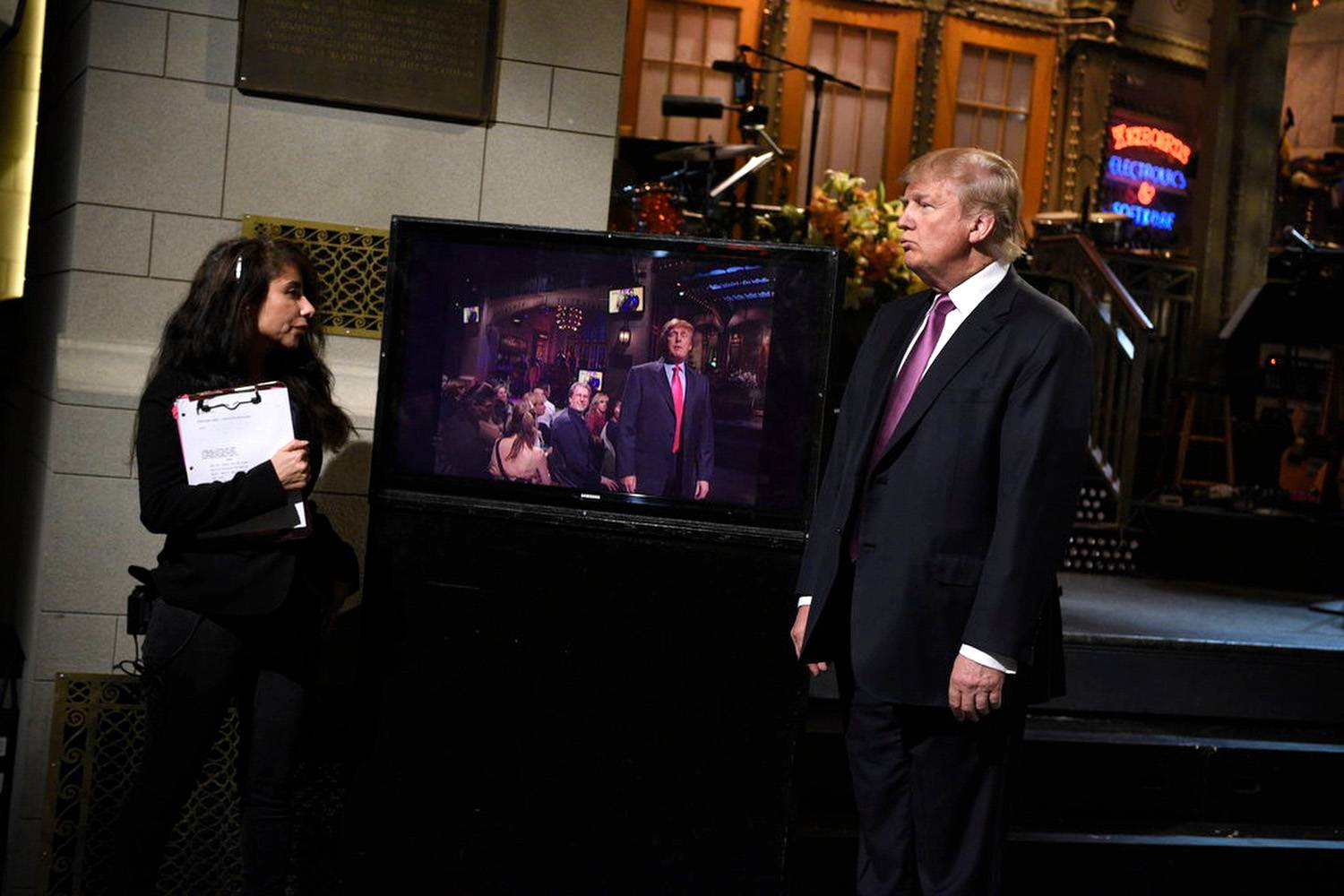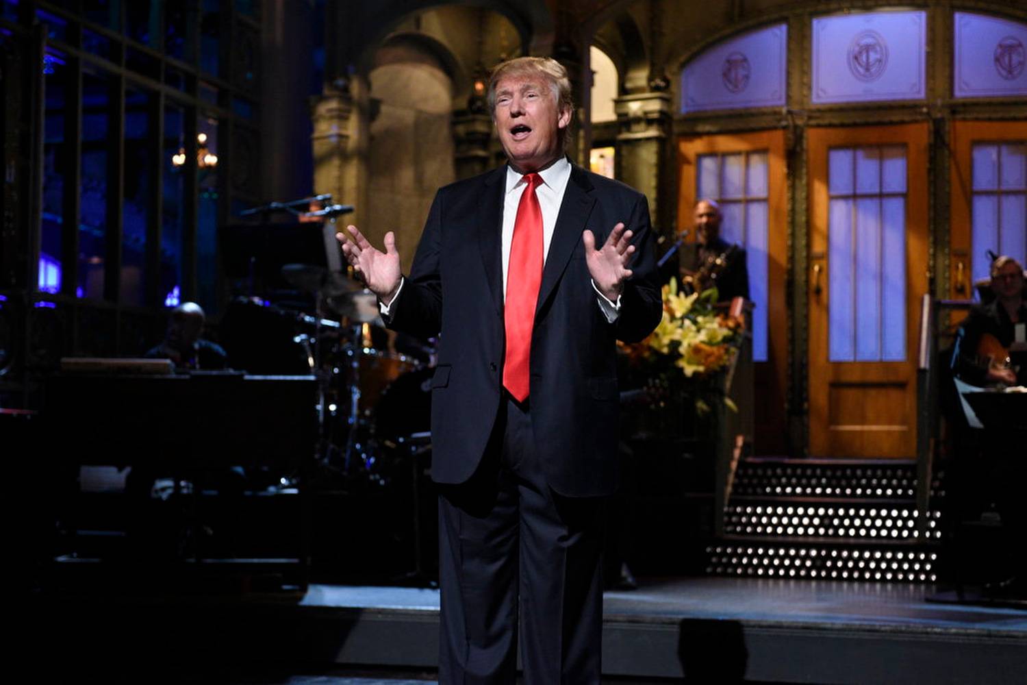 Republican presidential hopeful Donald Trump appears onstage while hosting Saturday Night Live.Dana Edelson