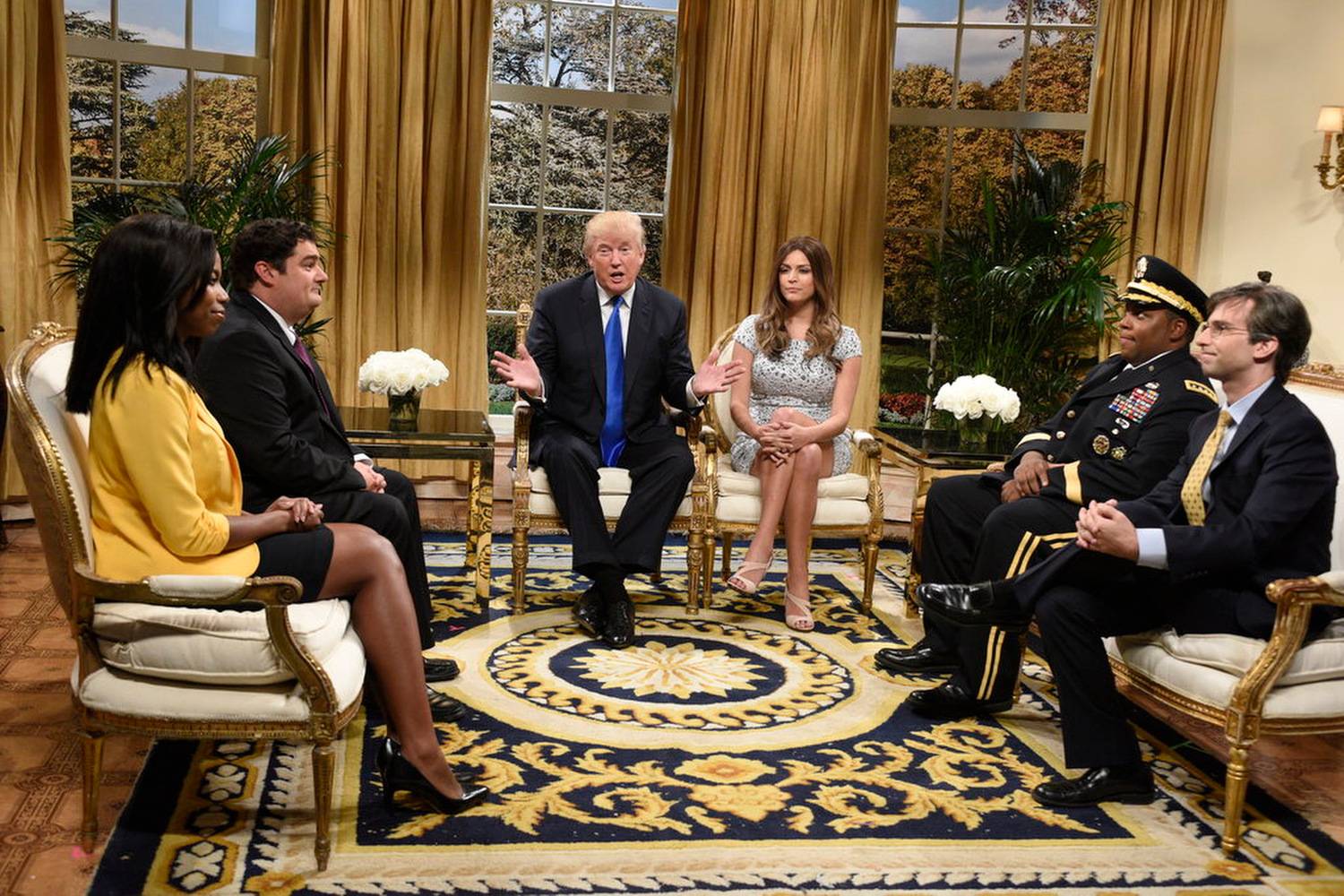 Taran Killam, left, Republican presidential candidate and guest host Donald Trump, center, and Darrell Hammond perform during the monologue on "Saturday Night Live", Saturday, Nov. 7, 2015.Dana Edelson
