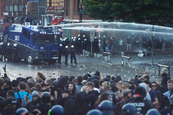 Riot police use water cannon during the ‘Welcome to Hell’ rally against the G20 summit in Hamburg, northern Germany, on July 6, 2017.ODD ANDERSEN/AFP / Getty Images
