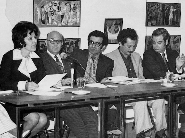 Acclaimed Lebanese novelist Emily Nasrallah, left, met in 1971 with Beirut's Pen Club president, writer and researcher Jamil Jabre, novelist Halim Barakat, the late Palestinian author Ghassan Kanafani and Lebanese novelist Yussef Habshi al-Ashqar.