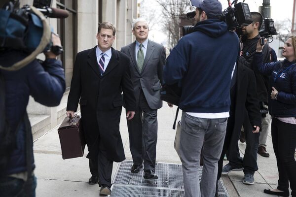 Former Penn State president Graham Spanier, center, walks with his attorney Sam Silver, center left, from the Dauphin County Courthouse in Harrisburg, Pa., Friday, March 24, 2017.Matt Rourke/The Associated Press