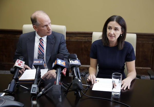 Katie McLaughlin, former wife of former Subway pitchman Jared Fogle, makes a statement on legal action filed on her behalf as attorney Mike Antrim looks on during a press conference in Noblesville, Ind., Monday, Oct. 24, 2016.Michael Conroy/The Associated Press