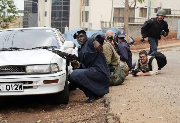 Kenyan security personnel and journalists duck behind a vehicle as heavy gunfire erupts from the Westgate Mall in Nairobi Kenya Monday Sept. 23 2013. Multiple large blasts have rocked the mall where a hostage siege is in its third day. Associated Press reporters on the scene heard multiple blasts and a barrage of gunfire. Security forces have been attempting to rescue an unknown number of hostages inside the mall held by al-Qaeda-linked terrorists.Jerome Delay/The Associated Press