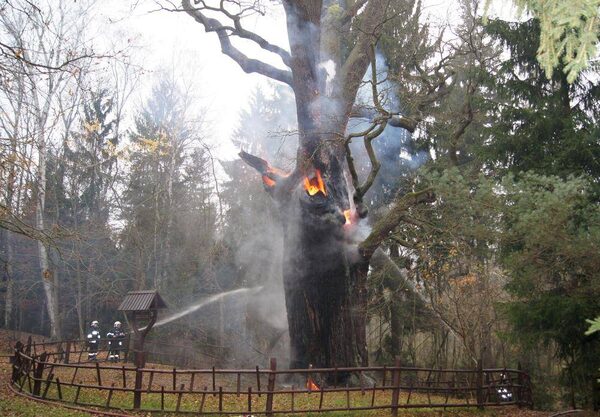 The tree is nicknamed "Chrobry" after a Polish medieval king. Its trunk circumference is more than 10 metres and it is more than 28 metres high. The oak is protected by law and an arsonist faces up to 10 years in prison if convicted. The police are investigating.