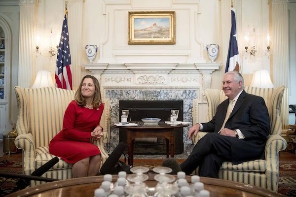 Secretary of State Rex Tillerson meets with Canadian Foreign Affairs Minister Chrystia Freeland, Wednesday, Feb. 8, 2017, at the State Department in Washington.Andrew Harnik/The Associated Press