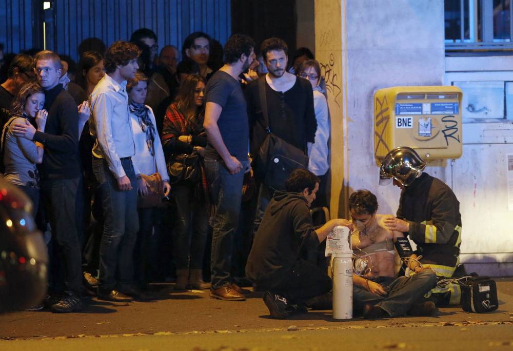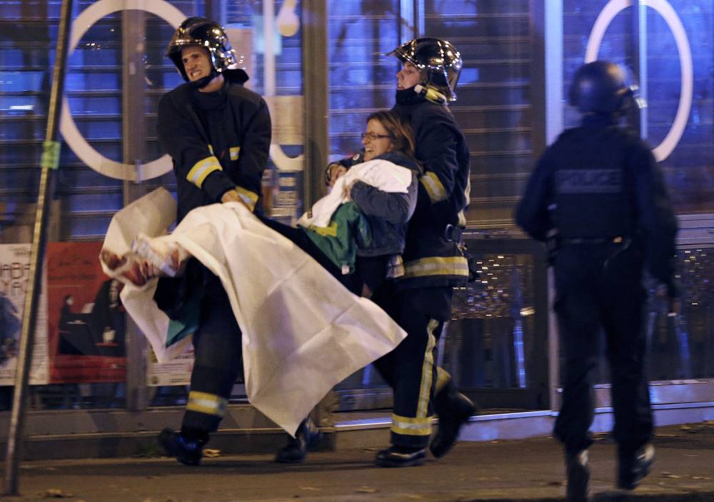 Members of the French fire brigade aid an injured person near the Bataclan concert hall following fatal shootings in Paris Nov 13, 2015. (Christian Hartmann/Reuters)
