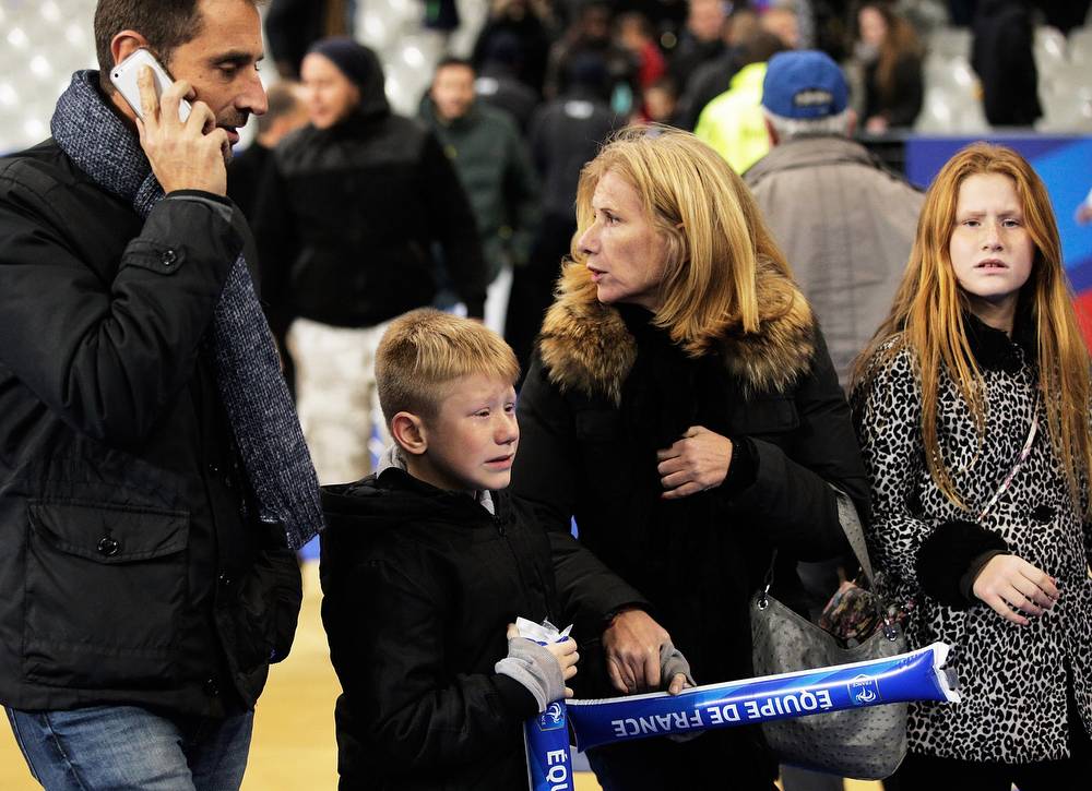Distressed spectators are seen after news of the bombing and terrorist attacks in Paris reaches fans after the International Friendly match between France and Germany at the Stade de France Nov 13, 2015. (Adam Pretty/Bongarts/Getty Images)