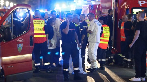 Police officers, firefighters and rescue workers are seen at the site of an attack on the Promenade des Anglais on July 15, 2016, after a truck drove into a crowd watching a fireworks display in the French Riviera town of Nice.VALERY HACHE/AFP / Getty Images