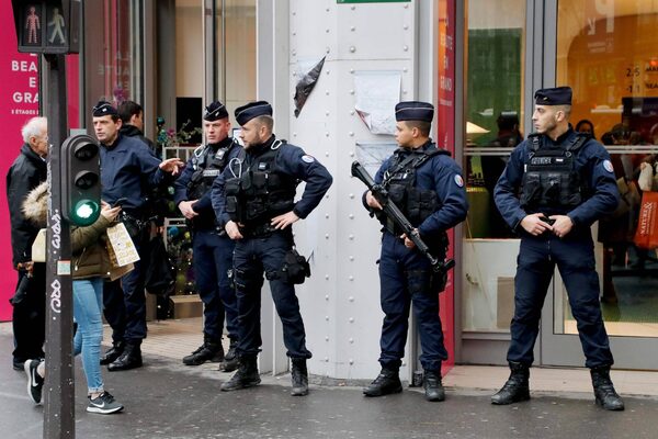 Police officers patrol near department stores in Paris before Christmas on Dec. 22, 2017.FRANCOIS GUILLOT/AFP / Getty Images