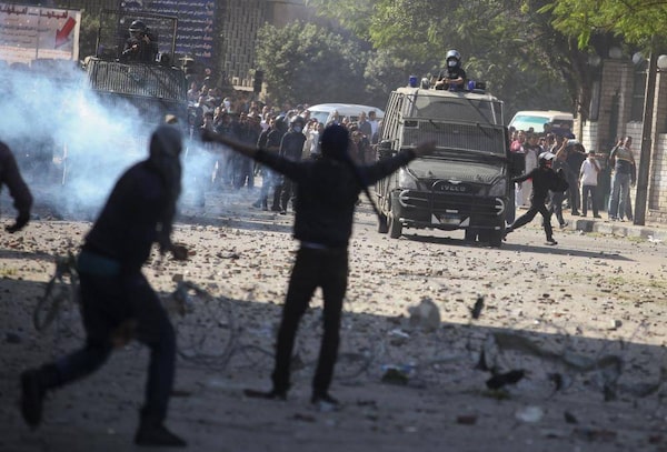 Protesters and riot police clash Sunday in downtown Cairo. The Egyptian Justice Minister joined criticism of a sweeping edict issued Thursday by President Mohamed Morsi that exempted the President’s decrees from judicial review until ratification of a constitution.TARA TODRAS-WHITEHILL/The New York Times