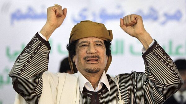 March 2, 2011 Libyan Leader Moammar Gadhafi gestures to supporters as he arrives to speak in Tripoli, Libya. Gadhafi survived a NATO missile strike Saturday, April 30, 2011 that killed his youngest son and three grandchildren and wounded friends and relatives.