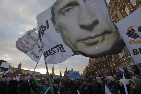 Muscovites attend a rally called "We are together" to support the annexation of Ukraine's Crimea to Russia in Red Square in central Moscow, March 18, 2014. Russian President Vladimir Putin, defying Ukrainian protests and Western sanctions, signed a treaty on Tuesday making Crimea part of Russia but said he did not plan to seize any other regions of Ukraine.MAXIM SHEMETOV/Reuters