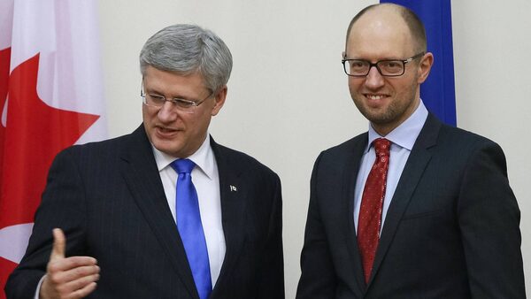 Ukrainian Prime Minister Arseny Yatseniuk, right, meets with Canadian Prime Minister Stephen Harper in Kiev, March 22.Reuters