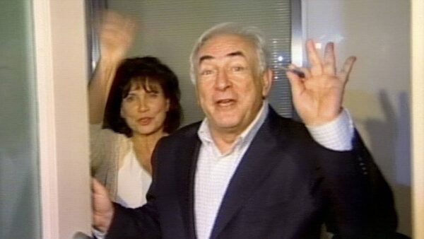 Former IMF chief Dominique Strauss-Kahn turns to the media after he and his wife Anne Sinclair regained entry to their apartment, after they discovered they were locked out, in this still taken from video early July 6, 2011.REUTERS TV/Reuters