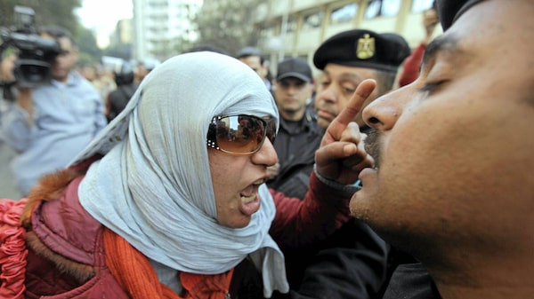 Angry Egyptian activist shouts at anti-riot policemen who block the way leading to journalists syndicate in downtown Cairo, Egypt, Wednesday, Jan. 26, 2011. A small gathering of Egyptian anti-government activists tried to stage a second day of protests in Cairo Wednesday in defiance of a ban on any gatherings, but police quickly moved in and used force to disperse the group.Ben Curtis/The Associated Press