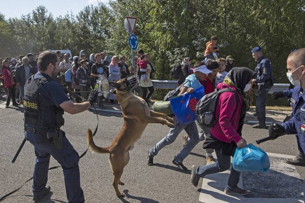Police with dogs try to contain hundreds of refugees who marched out of the collection point of Roszke near the border of Hungary and Serbia.David Maurice Smith