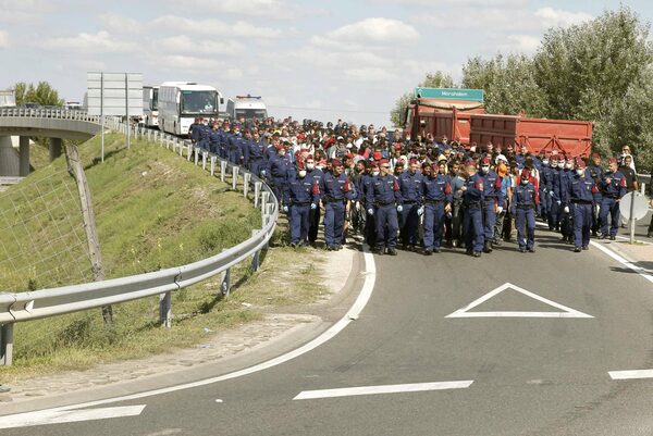 Hungarian police escort migrants back to a collection point in the village of Roszke.Marko Djurica/Reuters
