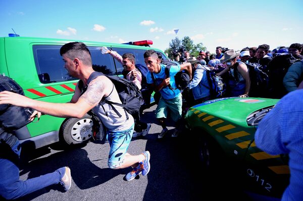 Migrants breake through a police line near a collection point of Roszke village at the Hungarian-Serbian border.Attila Kisbenedek/AFP / Getty Images
