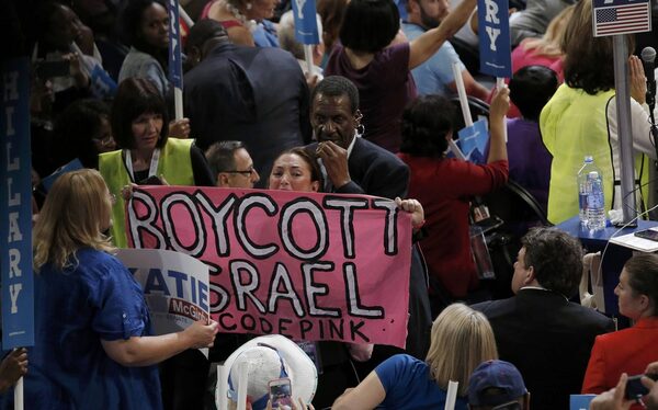 A security officer watches Code Pink protestors as they unfurl a banner on the floor of the convention.Mike Segar/Reuters