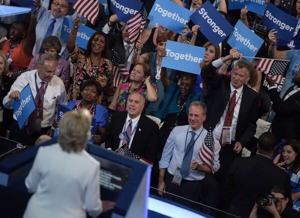 Democratic presidential nominee, Hillary Clinton, celebrates at the closing of the party’s national convention.Robyn Beck/AFP / Getty Images