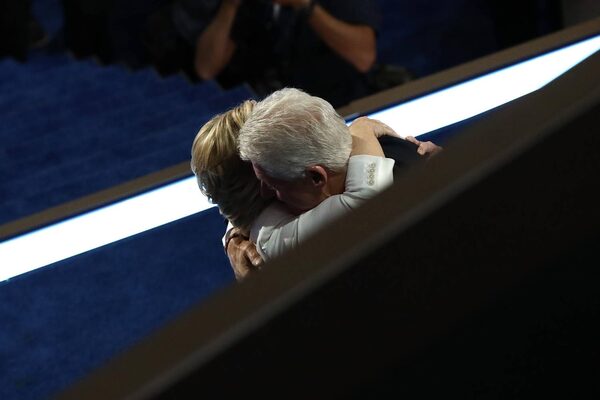 Democratic presidential candidate Hillary Clinton is embraced by her husband, former US President Bill Clinton, at the end of the Democratic National Convention.Win McNamee/Getty Images