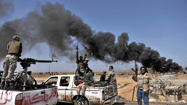 Smoke billows as Libyan rebels progress westward from the town of Bin Jawad towards Moammar Gadhafi's hom town of Sirte on March 28, 2011.ARIS MESSINIS